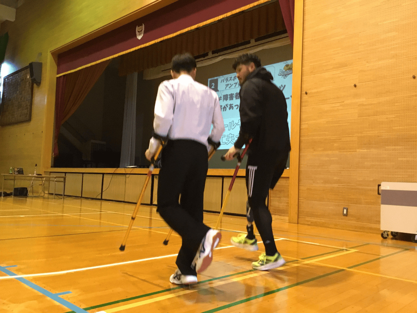 義足を外して持たせたり、クラッチを使って生徒に歩き方、走り方を教えたり、聞いているだけではなく、どんどん関わっていただきました。