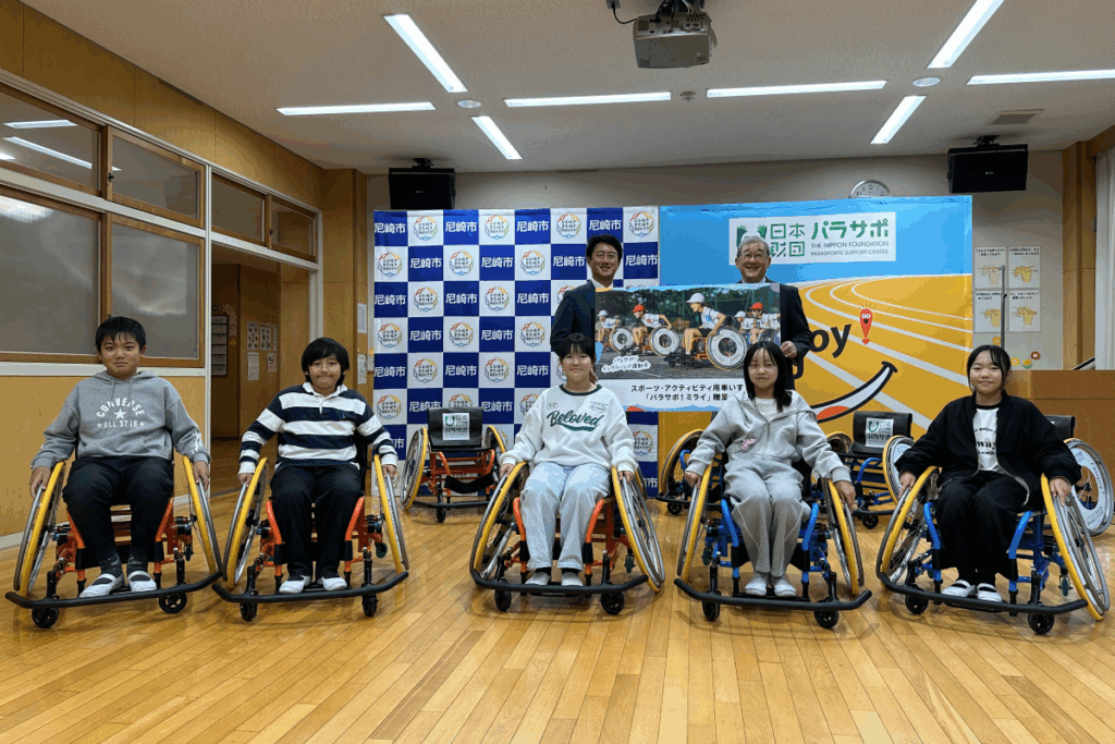 日本財団パラスポーツサポートセンター(パラサポ、所在地:東京都港区、会長:山脇康)は、2025年11月26日、学校の運動会をきっかけにインクルーシブ教育を推進するプログラム「パラサポ!インクルーシブ運動会」のインクルーシブな種目「車いすリレー」等で使用していただく「パラサポ!ミライ」10台を、兵庫県尼崎市へ贈呈しました。今回の尼崎市は、通算12自治体目、関西エリアとしては初めての贈呈先です。12自治体目にして初めて地元の小学生が贈呈式に参加し、尼崎市の松本眞市長と尼崎市立杭瀬小学校の児童5人が「パラサポ!ミライ」に試乗しました。