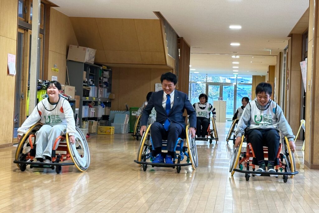 松本市長は、挨拶のなかで「本市でもインクルーシブ教育に予算をつけているところです。支援が必要なお子さんの学習権を保障する視点だけでなく、一緒に学ぶお友だちが、共生社会とはどんなものかを考え工夫していく、そういう教育的な意味が、このたび寄贈いただいた『パラサポ!ミライ』の活用により、車いすリレーなどを通じて、スポーツ性と共生が両立する機会が、期待できるのではないかと思っております。パラスポーツの普及とインクルーシブ教育の理解促進に活用させていただきます」と話しました。