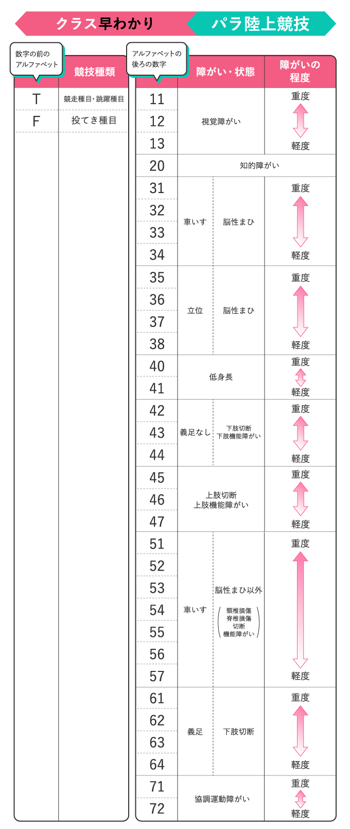 ※こちらの<クラス早わかり>は、Kobe 2024 Para Athletics World Championshipsの資料を参考に作成しています。