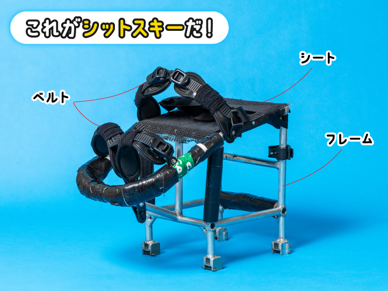 シットスキーは、アルミでできたフレーム、シート、ベルトでできていて、フレームの下にスキー板を2本取り付けて滑ります。また、ストックを手に持ち、雪の上を滑るときにバランスを取ったり、雪面を突いて進んだりします。