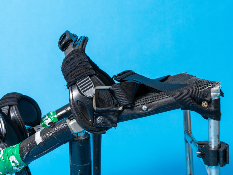 ・ベルトやクッション:姿勢を安定させるほか、体とシートをフィットさせるために使います。選手たちはそれぞれで工夫しています。