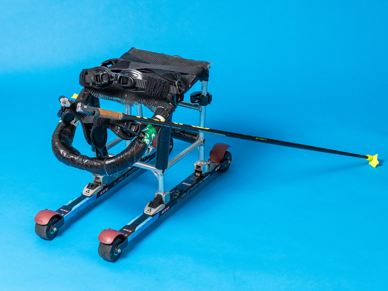 シットスキーは、座った状態でスキーを滑るための用具です。ノルディックスキー(クロスカントリースキー、バイアスロン)で使われます。クロスカントリースキーは坂道や平地を滑り、速さを競います。バイアスロンは、滑るだけでなく射撃も行う競技です。