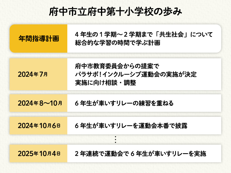 府中第十小学校は、総合的な学習の時間で、福祉の学習を1学期から2学期にかけて実践する年間学習計画を組んでいた学校でした。その計画の中にインクルーシブ運動会を位置づければ、より効果的に障がい理解教育、共生社会の実現に向けた子どもたちの学びが深まるだろうと考えました」