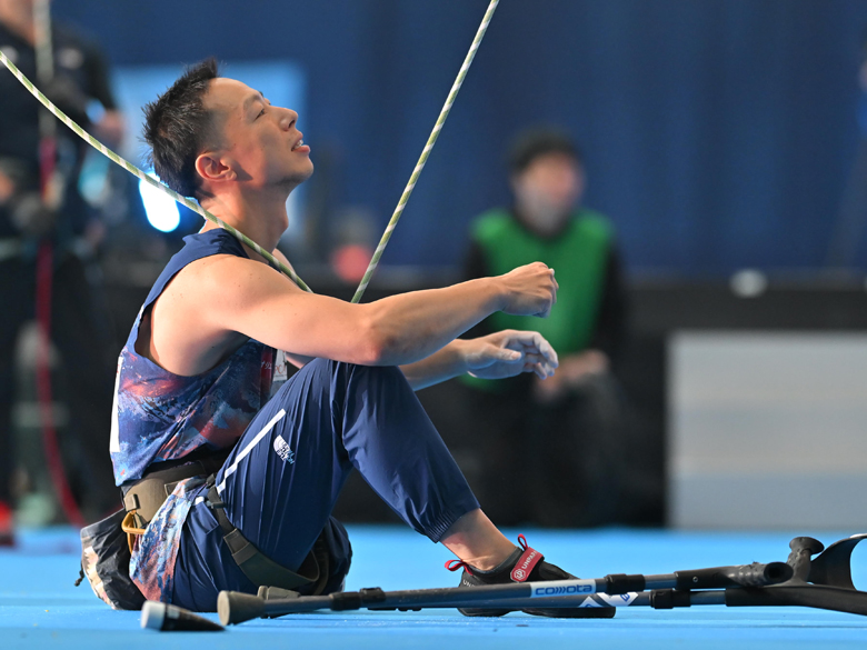 2025年9月の世界選手権(韓国)で4位の岡田卓也は、「関節可動域および筋力とその他の機能障がいカテゴリー」の中でもっとも重度のRP1クラスの選手。序盤は軽快に登ったものの、前日のワーキングセッションでも苦戦した中間の難所をクリアできず、悔しさをにじませた。それでも「これまでいろんなクラスが混ざって同じ1本のルートを登ることはなかったので、楽しみながら登った」とポジティブに話した。