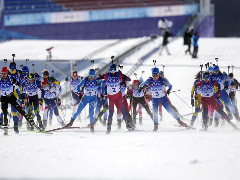 オリンピックのバイアスロンは、男子20kmインディビジュアル、女子15kmインディビジュアル 、男子10kmスプリント、女子7.5kmスプリント、男子12.5kmパシュート、女子10kmパシュート、男子15kmマススタート、女子12.5kmマススタート、男子4×7.5kmリレー、女子4×6kmリレー、混合4×6kmリレー(男子+女子)の計11種目。種目に応じてミスショット1発ごとに1分のペナルティタイムが加算されるか、ペナルティループを走る必要がある。