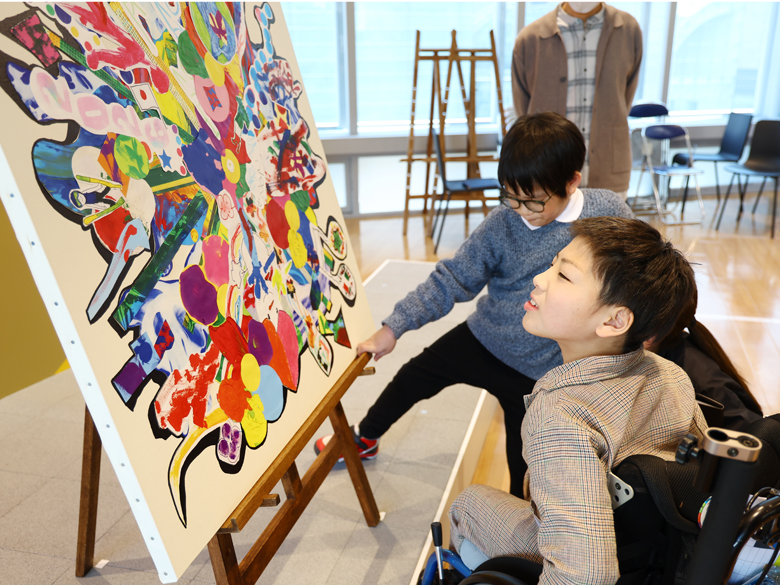 都立墨東特別支援学校の児童・生徒を代表して渡邊英瑠(小学部の5年)さん、西直哉(小学部の4年)さんが見守る中、選手への応援を形にしたアートがお披露目。タイトルは『応援パラ火』。「“応援のチカラ“のタネ」の絵を一つひとつ切り抜き、花火のように放射状にコラージュした作品だ。