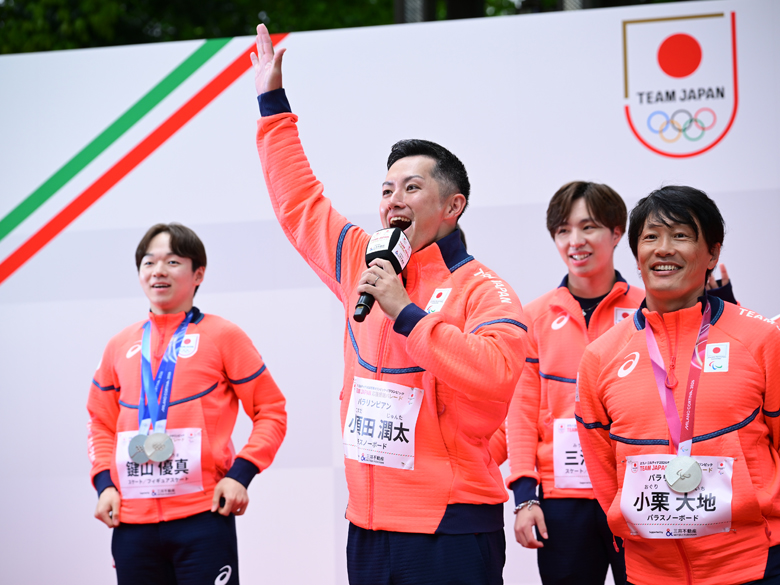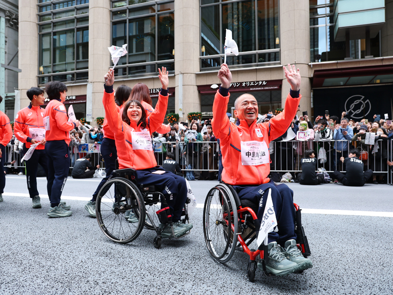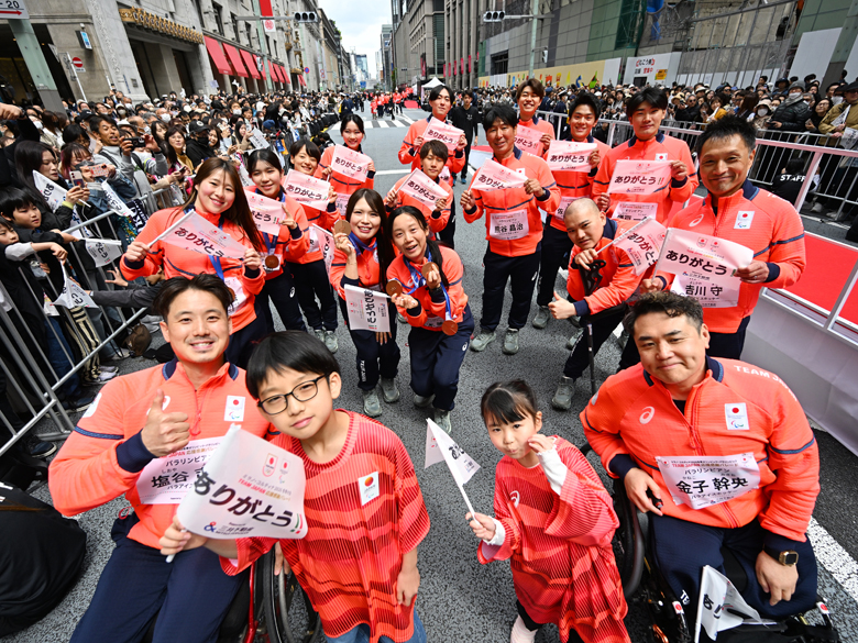 日本パラリンピック委員会の森和之会長は、「感謝をお伝えするパレードに多くの皆さまにご参加いただき、ありがたく思う。大会期間中にいただいた温かいメッセージは選手にしっかりと届いていた。最後の瞬間まで皆さまの応援が大きなチカラになった」と、集まった観客や支援者に感謝の気持ちを伝えた。